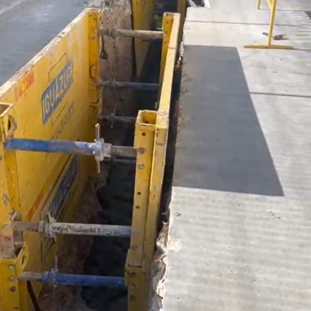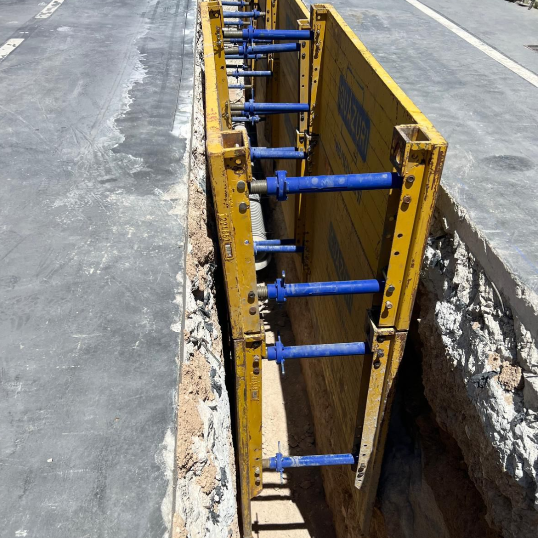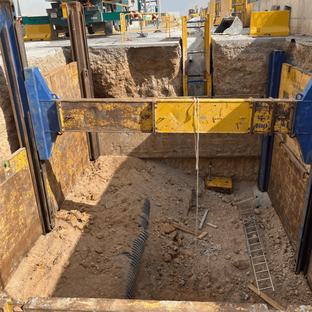Nuestra intervención se ha centrado en el suministro de sistemas de entibación adaptados a las necesidades específicas de la obra, combinando material existente del propio cliente con módulos adicionales de Iguazuri.